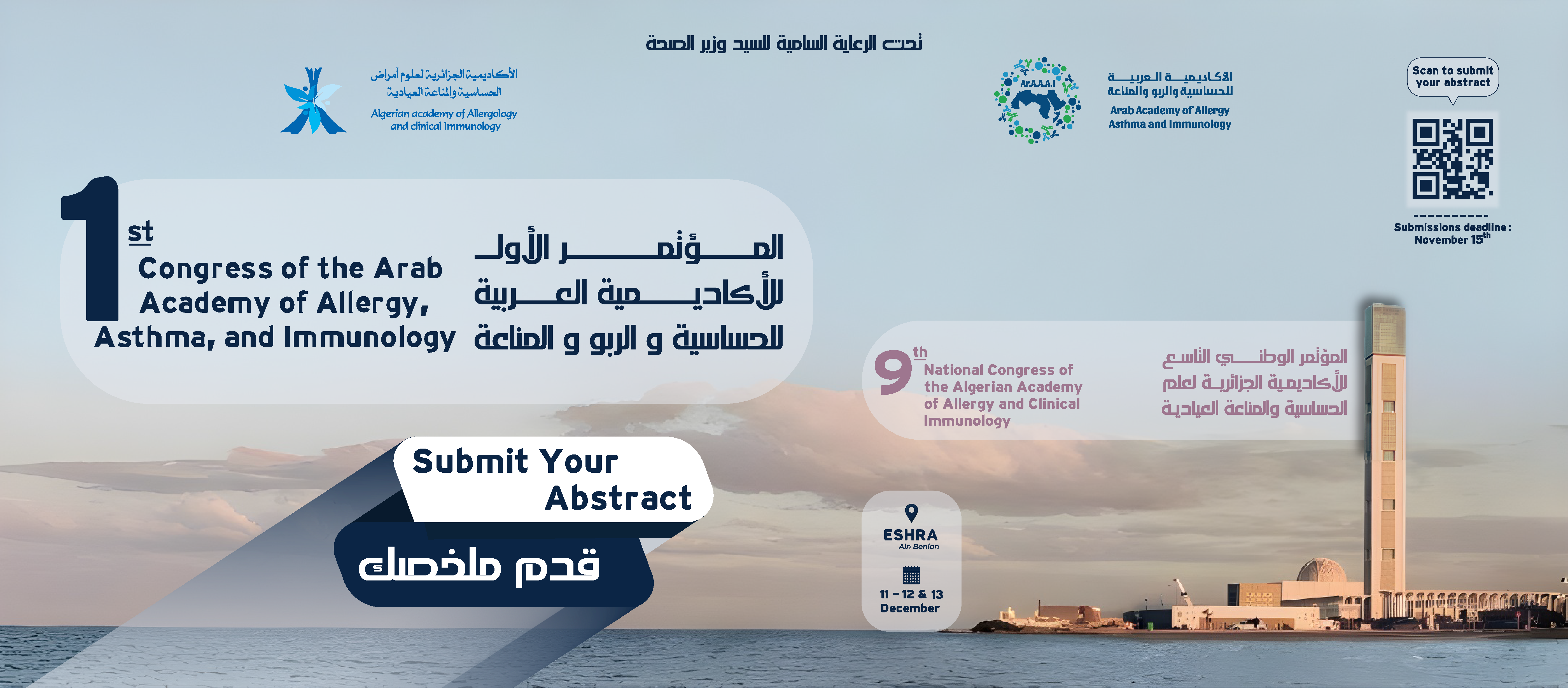 Nous avons le plaisir de vous inviter à soumettre vos résumés pour le Premier Congrès Arabe d’Allergologie, qui se tiendra à Alger, du 11 au 13 décembre 2025.